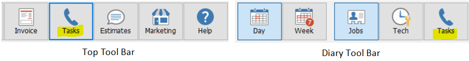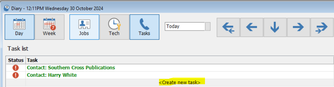 Task Manager, Accessing: You access the task manager from the top tool bar or diary screen, for the diary select the diary icon from the top tool bar, in the top right hand corner of the diary screen you will see five icons, the last one is a telephone; select this to view the diary screen of the task manager. Alternatively you can short cat to the task manager diary screen by selecting the task icon from the top of screen.