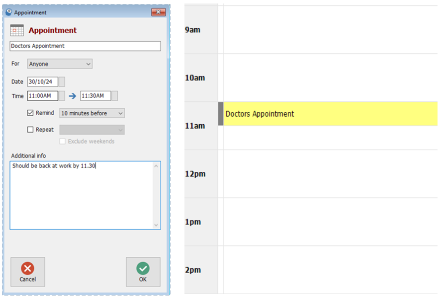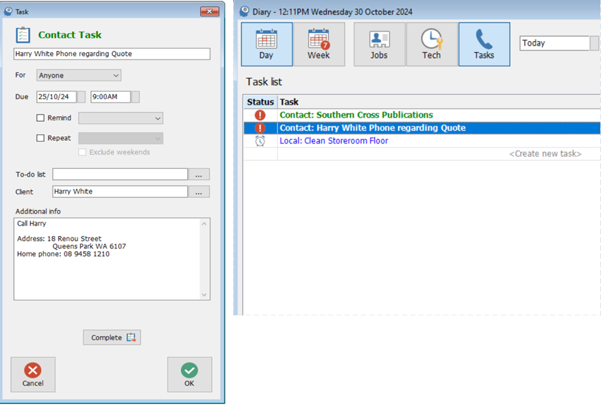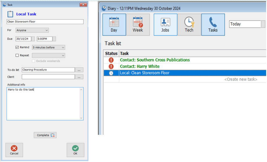 To save the tasks select OK (F12) from the bottom of the form. The record will now display on both the day and week views of your diary screen.