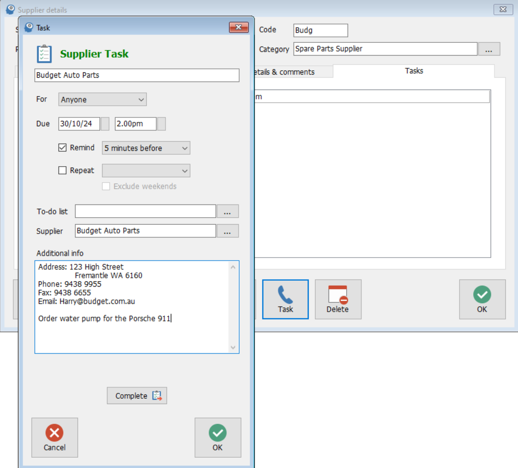 Task Manager, Creating A Supplier Task: To create a supplier task you need to open the supplier form and select the task option The supplier task form is now in view, as with any other task you can set a due date, time and whether you want to be reminded when the task is due, it is also possible to set a repeat within a specified time. As with other task functions it is also possible to attach a checklist if required.