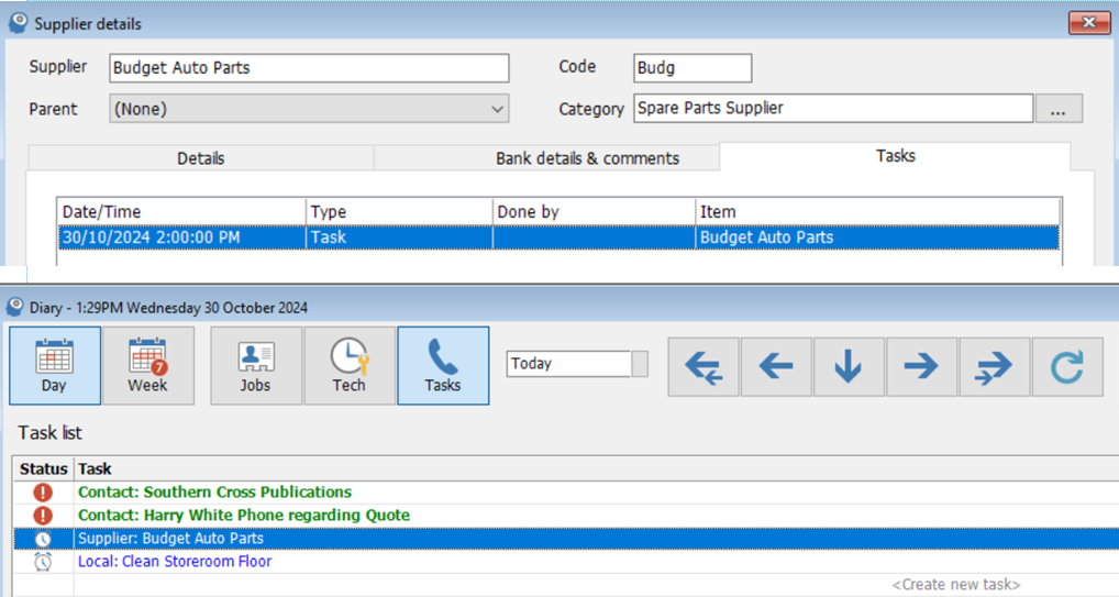 The supplier task is displayed both in the task section of the supplier form and on the diary screen
