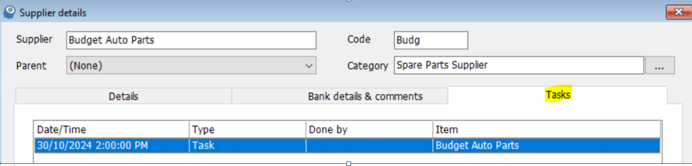 The task will appear in your list as a supplier task, to view simply point and double click on the entry. To view previous tasks by supplier open the supplier form and select the tasks tab.