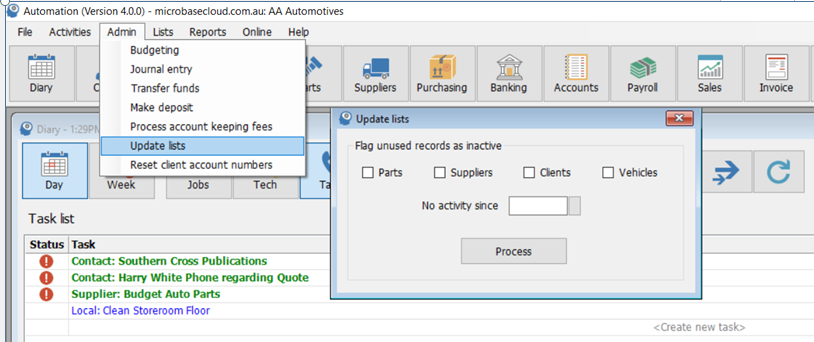 Automation gives you the ability to make unused records inactive for clients, vehicles, suppliers and parts with no activity since a selected date. This option allows you to manage these lists so you only see active records, inactive records can of course be made active at any time by opening the relevant form and form and removing the inactive flag option.